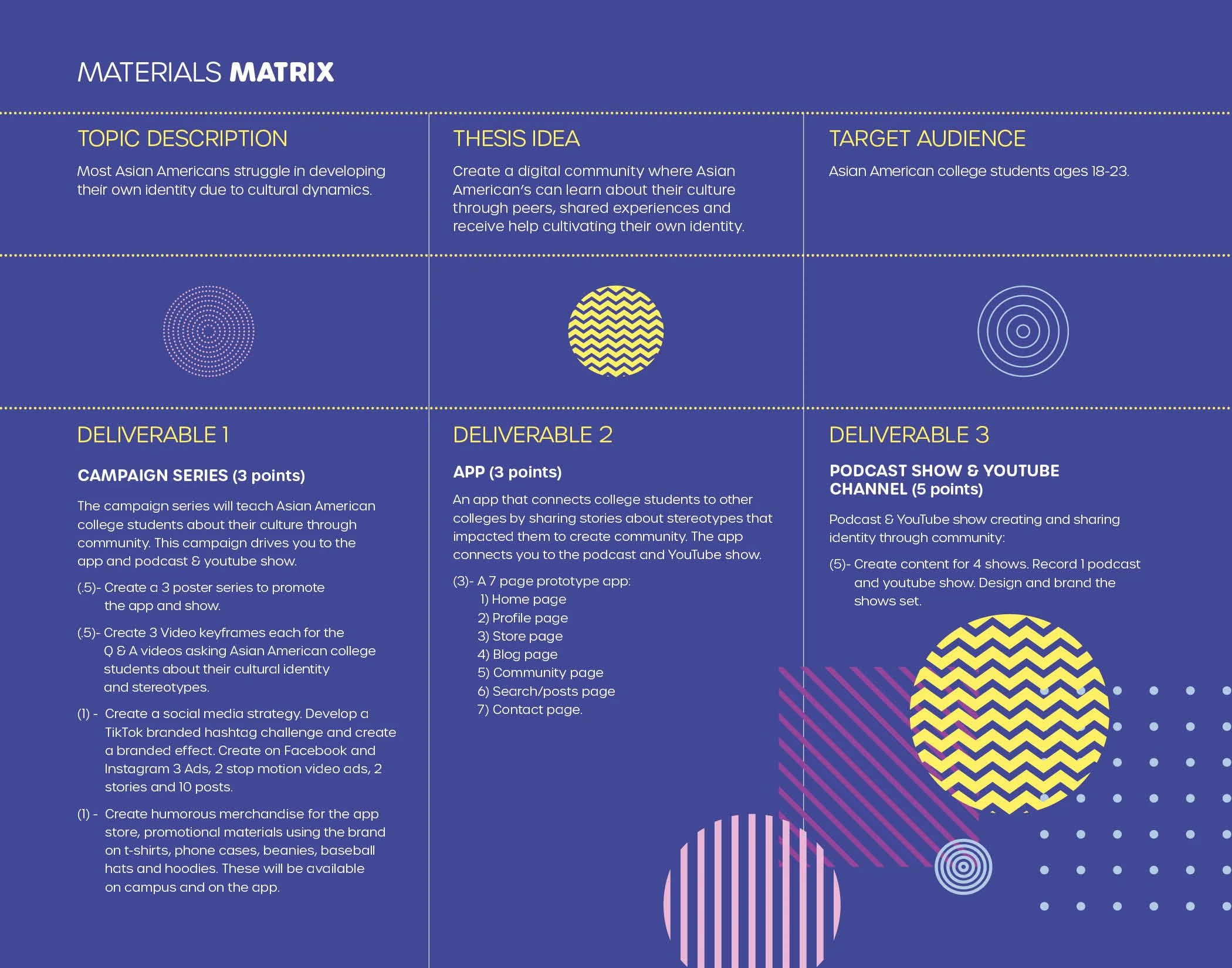 This week I researched areas surrounding my thesis which lead me to better ideas. I used word associations, mind mapping and visuals related to my topic which helped me come up with several keywords. I narrowed it down to these three keywords because they relate to my topic, goal and audience. The first word I chose was mixed because it means combining two or more things together which symbolizes all Asian cultures cultivating their identities through building community. The second word I chose was connected. Connected means to bring together. By connecting Asian cultures together allows each of them to relate and learn experiences from others by sharing their personal story. The third word I chose was blended. Blended means to combine together. By combining together it creates identity through community allowing Asian Americans to have a voice.
