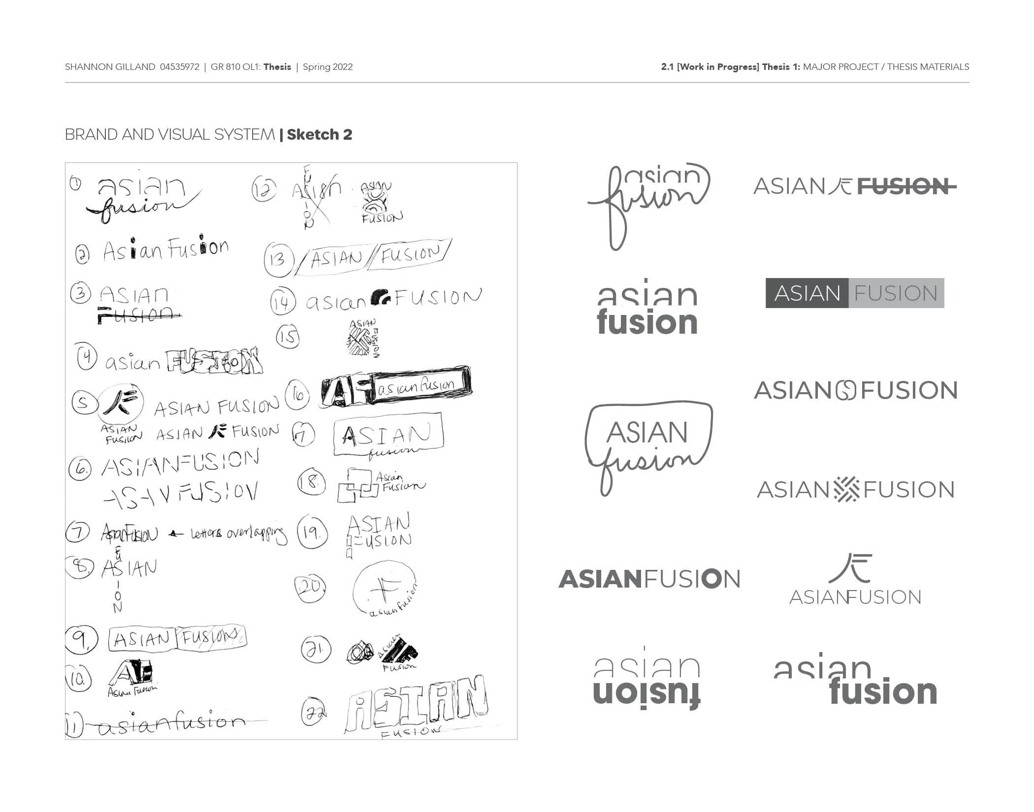 I started researching names by looking up Asian graphics for inspiration. I played around with combining words together for a double meaning. I added taglines to help the name be more meaningful. I looked up specific graphics that would relate to the meaning. I learned that coming up with the name can be challenging especially if you have a specific audience that needs to relate to it. Out of the three names I chose to explore more, Asian Fusion (to join two or more things together to form a single entity) seems to fit my thesis well. I wanted something to connect all of the different Asian cultures together. While doing research I came across similarities within the different Asian groups depending on which area of Asia someone comes from. For example, people from East Asia tend to eat with chopsticks while other Asian groups do not. I'm trying to find similarities within the groups depending on where they come from so I can create a symbol or marking to represent that area. I can use it throughout my visual system. For each thesis name I created sketches and started some rough computer comps.