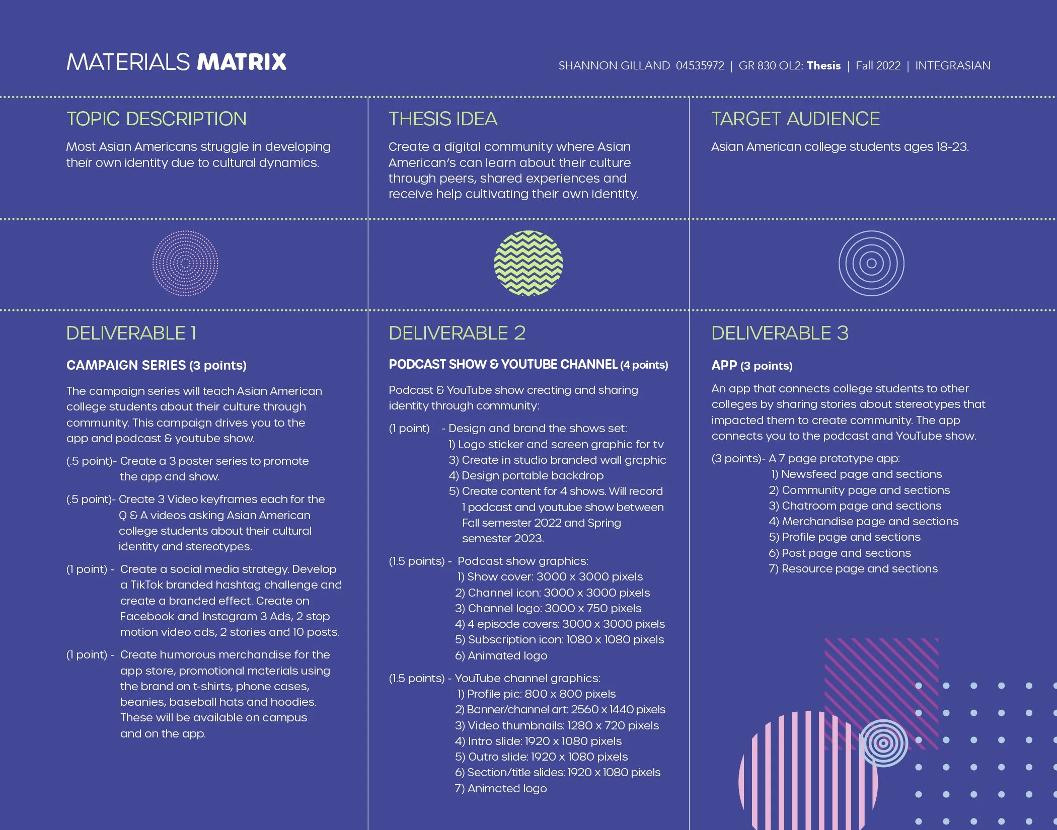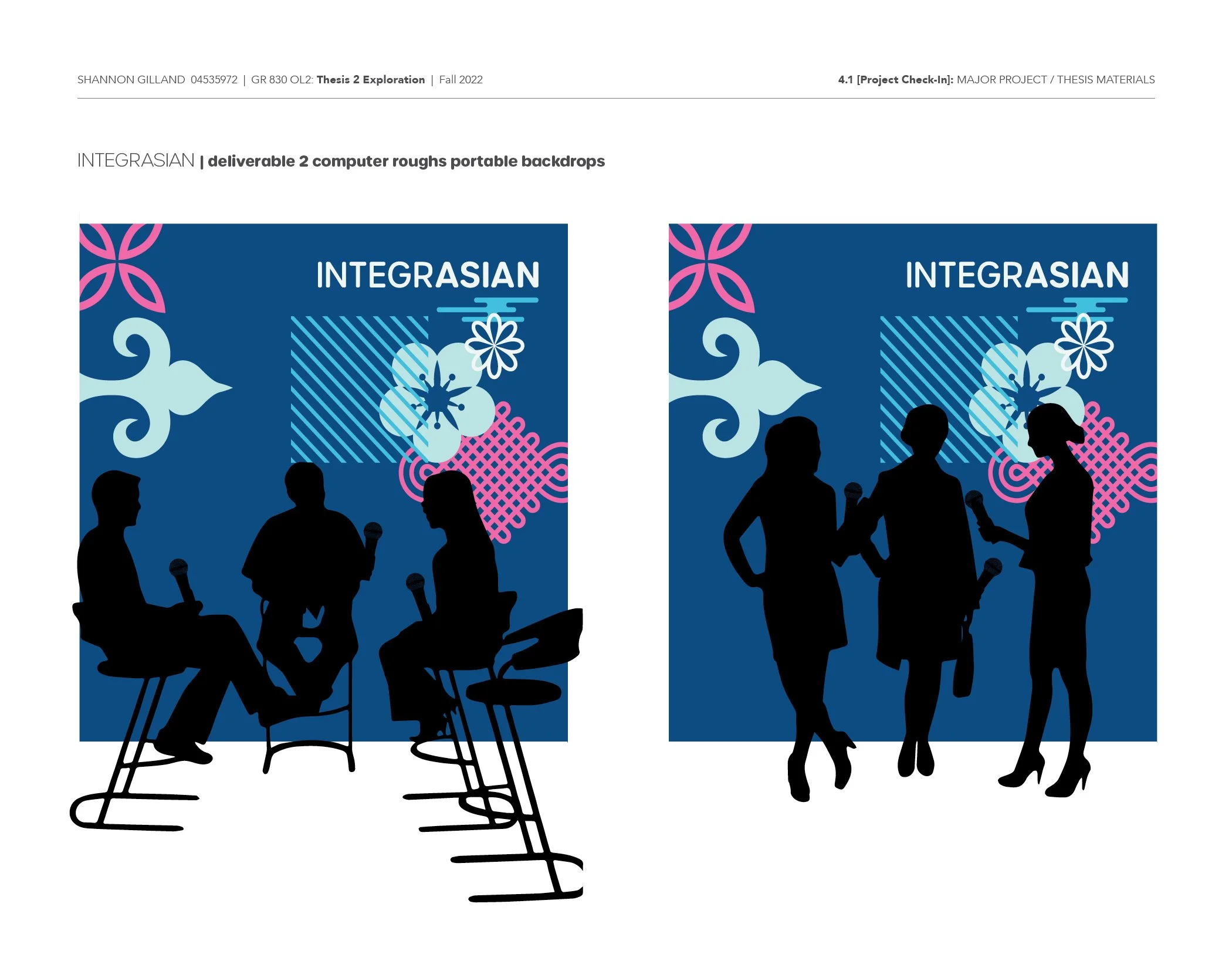 I researched other symbols that represent each area of Asia so I can create more brand elements. For the portable backdrops that I experimented with last module I added silhouettes of people siting and standing. I redesigned each so the graphics could be more visible. For the process book I will add the backdrops in a room with real people in front of them to show perspective. Next week I will revise my other deliverables by integrating the Asian and American elements into each. I will add more images showing students engaging together and show the elements integrating with the images more.